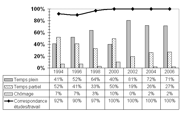 Comme c'était le cas lors des relances antérieures, l'entrée sur le marché du travail des répondants du bac en enseignement au préscolaire et au primaire se fait par le biais d'emplois contractuels (90,3 % des postes occupés sont à caractère temporaire). En revanche, la plupart des autres statistiques relatives à l'emploi leur sont favorables : ils travaillent presque tous (98,4 %); dans tous les cas, ces emplois correspondent à la formation reçue et ce sont en majorité des emplois à temps plein (71,4 %). Par contre, pour un certain nombre d'entre eux, les délais avant de décrocher un premier emploi à temps plein ont été plus longs lorsque comparés à la dernière relance (plus de six mois : 28,6 % vs 7,1 %) et ils sont plus nombreux à recevoir un salaire annuel moins élevé (22,2 % gagnaient moins de 31 000 $ par année vs 14,6 % en 2004). Notons également que ces diplômés sont presque exclusivement des femmes (93 %) et qu'ils prennent connaissance de leur premier emploi principalement lors d'un stage (dans 39,3 % des cas) ou lors de visites, lettres et téléphones aux employeurs (25 %). |