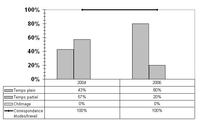 Étant donné le nombre restreint de répondants (5) du bac en enseignement de l'anglais, langue seconde, aucune conclusion fiable ne peut être tirée des données relatives à leur insertion professionnelle. Mentionnons, tout de même, qu'ils travaillent tous, que ces emplois correspondent à la formation reçue et que deux répondants sur cinq ont décroché leur emploi avant même la fin de leurs études. Par contre, les emplois contractuels et précaires qui sont généralement le lot des diplômés du baccalauréat en enseignement au début de leur carrière sont, ici aussi, en plus grande nombre (trois postes sur cinq sont temporaires). Soulignons également que deux répondants sur cinq avaient plus de trente ans et qu'ils prennent connaissance de leur premier emploi par le biais de stage (2/5) et de visites, lettres et téléphones aux employeurs (3/5). |