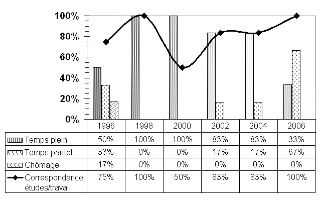 En raison du très petit nombre de répondants aux maîtrises en lettres, toutes les données statistiques relatives à leur insertion professionnelle doivent être considérées avec réserve. Mentionnons tout de même que deux ans après l'obtention du diplôme, il n'y a personne au chômage; tous les emplois correspondent à la formation reçue; mais deux répondants sur trois travaillent à temps partiel dans un poste contractuel à statut temporaire et plus de six mois ont été nécessaires avant de décrocher ce travail. Quant à ceux qui ont poursuivi des études, deux personnes se sont inscrites au doctorat en études françaises et l'autre au doctorat en linguistique. Soulignons également certaines caractéristiques qui les distinguent de l'ensemble des répondants du 2e cycle : - ils sont généralement plus jeunes (cinq répondants sur six ont moins de trente ans vs 45,9 %); - ils ont tous fait des études à temps complet vs 58,3 %; - et la plupart d'entre eux (cinq sur six) n'avait jamais eu d'emploi régulier, autre qu'un travail étudiant, avant d'entreprendre leurs études de maîtrise, vs 49 %. |
