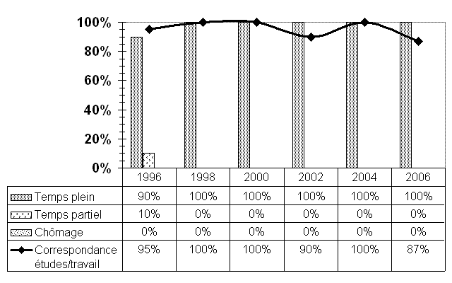 Qu'ils aient conservé ou réintégré leur ancien emploi, ou qu'ils aient eu à en trouver un nouveau (ce qui était le cas de 25 % d'entre eux), l'accès au marché du travail pour les répondants des maîtrises en fiscalité ne présente pas de véritable difficulté, tout comme c'était le cas lors des enquêtes précédentes. D'ailleurs toutes les données statistiques relatives à l'emploi sont supérieures à celles de l'ensemble des répondants du 2e cycle : - il n'y a pas de chômage vs 3,5 %; - tous travaillent à temps plein vs 89,5 %; - dans 86,7 % des cas il y a correspondance études-travail vs 83,9 % - en outre, ceux qui ne travaillent pas dans leur domaine de formation le font par choix; - plus de neuf fois sur dix (93,3 %), ce sont des postes permaments; - les délais avant de décrocher un emploi à temps plein sont relativement courts (moins de trois mois : quatre répondants sur quatre vs 66,9 %); - les revenus sont généralement plus élevés (plus de 72 000 $ par année : 57,2 % vs 23,5 %). Soulignons également qu'ils sont en général plus âgés (plus de trente ans : 68,8 % vs 54,1 %); que 25 % d'entre eux avaient déjà fait des études supérieures (maîtrise ou doctorat) avant d'entreprendre leur maîtrise en fiscalité vs 10,7 % et que dans 81,3 % des cas ils étaient sur le marché du travail avant cette maîtrise vs 51 %. |