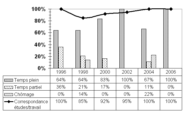 De prime abord, la situation de l'emploi pour les diplômés des maîtrises en enseignement paraît excellente : ils travaillent tous, ce sont des emplois à temps plein qui correspondent à la formation reçue, tous les postes sont permanents et les revenus sont passablement élevés (une personne sur deux gagne plus de 63 000 $ par année vs 37,9 % pour l'ensemble du 2e cycle). Toutefois, il importe de souligner qu'aucun de ces emplois n'a été obtenu à la suite de ces études. Tous les répondants disent avoir conservé ou réintégré leur ancien emploi. La maîtrise en enseignement semble avoir eu pour fonction principale le perfectionnement et non l'insertion au marché du travail. Mentionnons aussi qu'un certain nombre d'entre eux ont poursuivi d'autres études : une personne au doctorat en enseignement, une autre au D.E.S.S. en enseignement collégial et deux autres au D.E.S.S. en administration scolaire. De plus, comparés à l'ensemble du 2e cycle, ces répondants se distinguent par les caractéristiques suivantes : - ils sont généralement plus âgés (ils ont tous plus de trente ans vs 54,1 %) et la majorité sont dans la trentaine (77,8 % vs 34,7 %); - ils sont plus nombreux à avoir déjà fait des études supérieures avant d'entreprendre la maîtrise en enseignement (22,2 % vs 10,7 %); - et plus fréquemment ils ont étudié à temps partiel (88,9 % vs 41,7 %). |