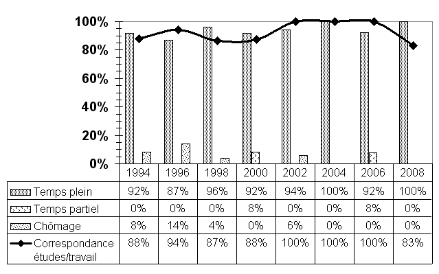 Avertissement: échantillon restreint Par contre, si on se fie à la tendance observée lors des relances antérieures, tendance qui se maintient, l'accès au marché du travail est rapide et facile: - des emplois à temps plein; - pas de chômage; - des salaires élevés. Trois répondants poursuivent des études de maîtrise en génie civil et un autre a fait un certificat en gestion des ressources humaines. |