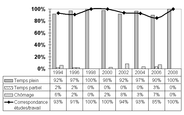 Avertissement: échantillon restreint Par contre, si on se fie à la tendance observée lors des dernières relances, tendance qui se maintient, l'accès au marché du travail est rapide et facile: - des emplois à temps plein qui correspondent à la formation reçue; - pas de chômage; - des postes permanents; - des salaires élevés. Une personne a poursuivi des études à la maîtrise en génie électrique et une autre a fait un diplôme de 2e cycle en gestion de l'environnement. |