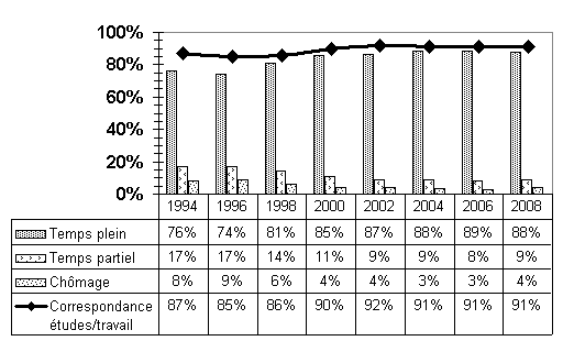Comparé aux relances précédentes, l'accès au marché du travail est particulièrement favorable. Si les relances des années 1990 à 1996 présentaient une situation d'insertion professionnelle qui graduellement se dégradait (les emplois à temps plein étaient de moins en moins nombreux - de 83,5 % à 74,4 % - le chômage augmentait - de 4,6 % à 8,5 % - la correspondance études-travail régressait - de 89,3 % à 85,1 % - et les emplois permanents étaient de moins en moins fréquents - de 74,1 % à 63 % ), depuis l'enquête de 1998 cette tendance c'est inversée et on constate une reprise qui ne se dément pas en 2008 (voir tableau). Toutes les variables relatives à l'emploi se maintiennent à leur plus haut niveau ou encore progressent légèrement. Le taux de chômage, les emplois à temps plein et la correspondance études-travail égalent les années les plus performantes des relances passées (3,5 % de chômage vs 3 % en 2006; 87,9 % d'emploi à temps plein vs 88,5 % en 2006; 91,2 % de correspondance études-travail vs 91,8 % en 2002). De plus, le pourcentage de postes permanents est à la hausse (71 % vs 66,5 % en 2006) et les salaires augmentent (plus de 45 000$ par année: 40,7 % vs 30,1%). Il n'y a que les délais avant de décrocher un premier emploi à temps plein qui soient un peu plus longs (plus de trois mois: 37,1 % vs 30,8 % en 2006). Mentionnons également qu'ils sont nombreux à poursuivre des études (30,7 % la première année et 22,1% en 2008) et que la grande majorité des répondants sont des femmes (64%). |