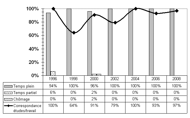 | Avertissement: Presque tous les répondants disent avoir conservé ou réintégré leur ancien emploi. Par conséquent, on ne peut pas parler d'accès au marché du travail et les données relatives à l'emploi réfèrent plutôt, aux études antérieures et à un cheminement de carrière. |