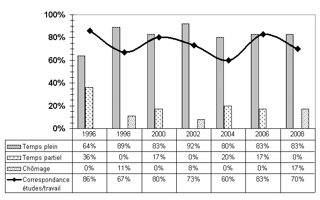Ils sont plusieurs à poursuivre des études et la plupart du temps au doctorat. Quant à ceux qui ont fait le choix d'accéder au marché du travail, leur insertion professionnelle semble un peu moins facile que par le passé: - un taux de chômage plus élevé; - des emplois qui correspondent moins souvent à la formation reçue; - des postes majoritairement précaires (temporaires); - par contre, les emplois sont tous à temps plein et les délais pour y accéder sont généralement courts. |