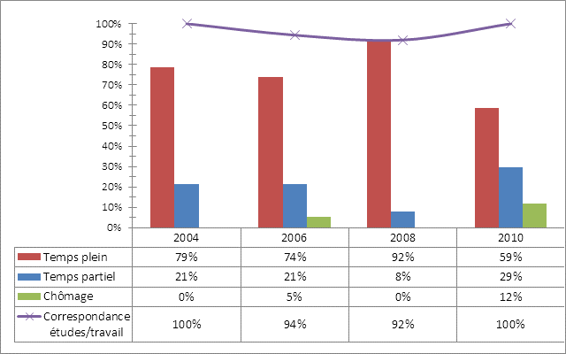 Accès au marché du travail plus difficile que par le passé : -moins d'emplois à temps plein; -plus d'emplois à temps partiel; -un taux de chômage plus élevé. Par contre, tous les emplois correspondent à la formation reçue et les emplois permanents sont plus nombreux.