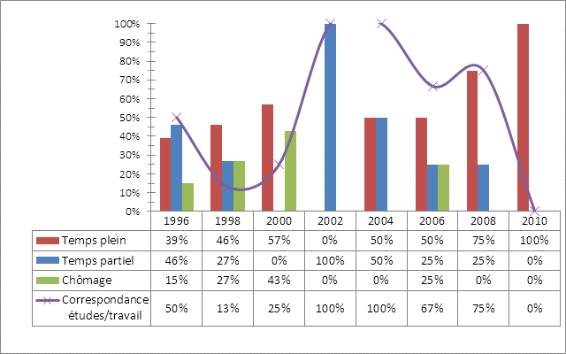 Avertissement : échantillon restreint. Tout comme c'était le cas lors des relances précédentes, la majorité des répondants poursuivent des études : deux à la maîtrise en études françaises et deux autres à la maîtrise en littérature. Les deux répondants qui travaillent ont conservé leur ancien emploi qui, toutefois, ne correspond pas à leur formation universitaire.