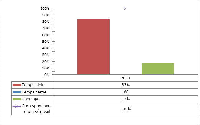 Avertissement : échantillon restreint, toutes les données relatives à l'insertion professionnelle doivent être considérées avec réserve. Mentionnons, tout de même, qu'un pourcentage important de répondants poursuivent des études aux cycles supérieurs : deux à la maîtrise en biogéosciences de l'environnement, un à la maîtrise en géographie et un autre en maîtrise en gestion de l'environnement. Ils sont relativement nombreux à avoir décroché un premier emploi à temps plein à la suite d'un stage (42,9%). Par rapport à l'ensemble des diplômés du 1er cycle : -ils sont généralement plus âgés (62,5% ont plus de 27 ans vs. 24,1%); -ils provenaient plus souvent d'une formation collégiale professionnelle (37,5% vs. 15,1%). Programme majoritairement masculin.
