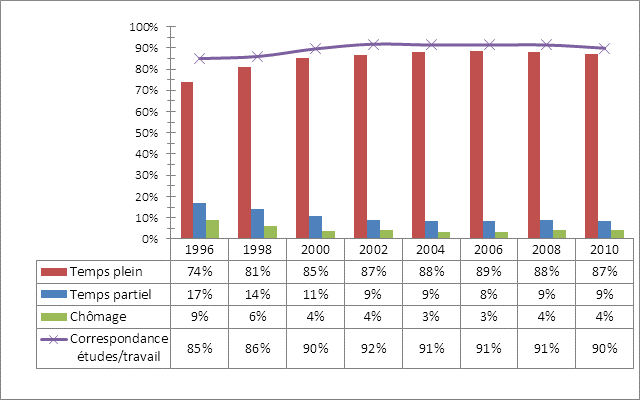 Si les relances des années 1990 à 1996 présentaient une situation d'insertion profesionnelle qui graduellement se dégradait par le fait que les emplois à temps plein étaient de moins en moins nombreux (de 83,5% à 74,4%), le chômage augmentait (de 4,6% à 8,5%), la correspondance études-travail régressait (de 89,3% à 85,1%) et les emplois permanents étaient de moins en moins fréquents (de 74,1% à 63%), à partir de l'enquête de 1998, cette tendance s'est inversée et dans les années 2000, l'accès au marché du travail fut généralement rapide et facile, une tendance qui ne se dément pas en 2010. Que ce soit le nombre d'emplois, les emplois à temps plein ou à temps partiel, le taux de chômage, la correspondance études-travail ou le nombre de postes permanents, toutes les variables relatives à l'emploi se maintiennent à leur plus haut niveau avec de légères fluctuations de relance en relance (voir le tableau ci-dessous). De plus, lorsqu'on compare la situation actuelle à celle qui prévalait lors de la Relance 2008, on constate : -que les délais avant de décrocher un premier emploi à temps plein sont plus courts (moins de 3 mois pour 67,8% vs. 62,9%); -et que les salaires augmentent (48,1% vs. 40,6% gagnent plus de 45 000$ par année). Mentionnons, également, qu'ils sont nombreux à poursuivre des études (30,4% en 2009 et 23,8% en 2010) et que les femmes restent majoritaires malgré une légère baisse (59% des répondants vs. 64% en 2008).