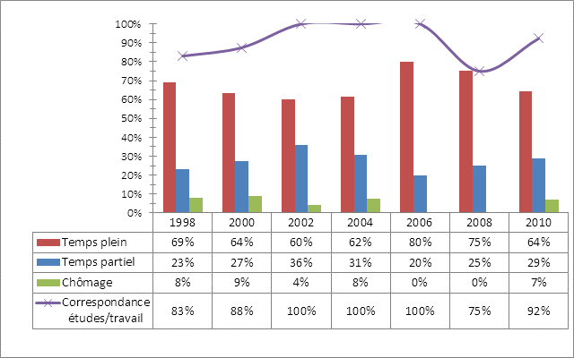 L'accès au marché comporte des aspects positifs et négatifs : -la très grande majorité des répondants sont en emploi dans des domaines qui correspondent à la formation reçue; -par contre, comme c'était le cas par le passé, les emplois à temps partiel et les emplois précaires (à contrat, temporaires) sont fréquents. Mentionnons, également que par rapport à l'ensemble des répondants du 2e cycle : -ils sont généralement plus âgés (+ de 30 ans: 75% vs. 54%); -ils étaient moins nombreux à avoir eu un emploi régulier autre qu'un emploi étudiant avant d'entreprendre la maîtrise (25% vs. 46,8%); -ils avaient déjà fait, plus souvent, des études de 2e cycle (31,3% vs. 11,8%). Programme essentiellement féminin. |
