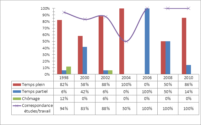 Avertissement : compte tenu du nombre restreint des répondants en emploi, aucune conclusion valable ne peut être tirée des données statistiques relatives à leur insertion professionelle d'autant plus que quatre répondants sur huit disent avoir conservé ou réintégré leur ancien emploi. Soulignons, malgré tout, que comme par le passé, ils sont nombreux à poursuivre des études au doctorat.