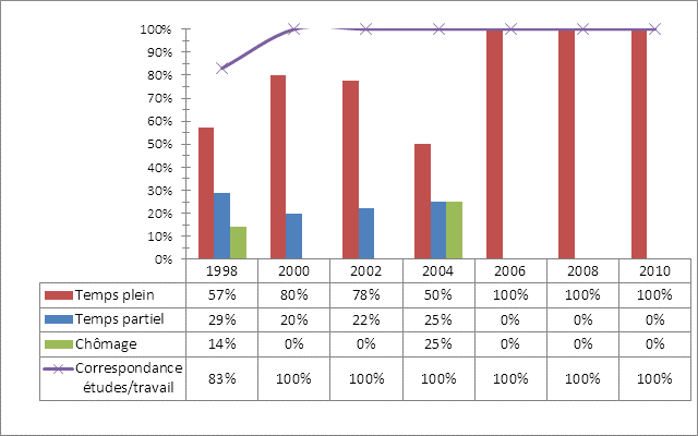 Avertissement : échantillon restreint Toutefois, si l'on se fie à la tendance observée lors des dernières relances (tendance qui se maintient), l'accès au marché du travail semble relativement aisé et ceci, malgré le fait que trois répondants sur neuf disent avoir conservé ou réintégré leur ancien emploi : -tous travaillent; -les emplois correspondent à la formation reçue; -ce sont tous des emplois à temps plein. Par contre, les emplois précaires (à contrat, temporaires) sont plus fréquents comparativement aux trois dernières relances (0% en 2004; 14,3% en 2006; 20% en 2008 vs. 33,7% en 2010). Une personne a poursuivi des études au microprogramme de 2e cycle en gérontologie. Programme majoritairement féminin. |