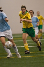 Sherbrooke, 16 mars 2009 - Le match aurait pu tourner d’un côté où de l’autre, mais un tir parfait de Marie-Émilie Perreault-Morier en fin de deuxième demie a finalement permis au Vert & Or de signer une victoire de 1-0 face aux Citadins de l’UQAM en quart de finale de la Ligue universitaire de soccer intérieur, samedi soir au Centre multisport Roland-Dussault.