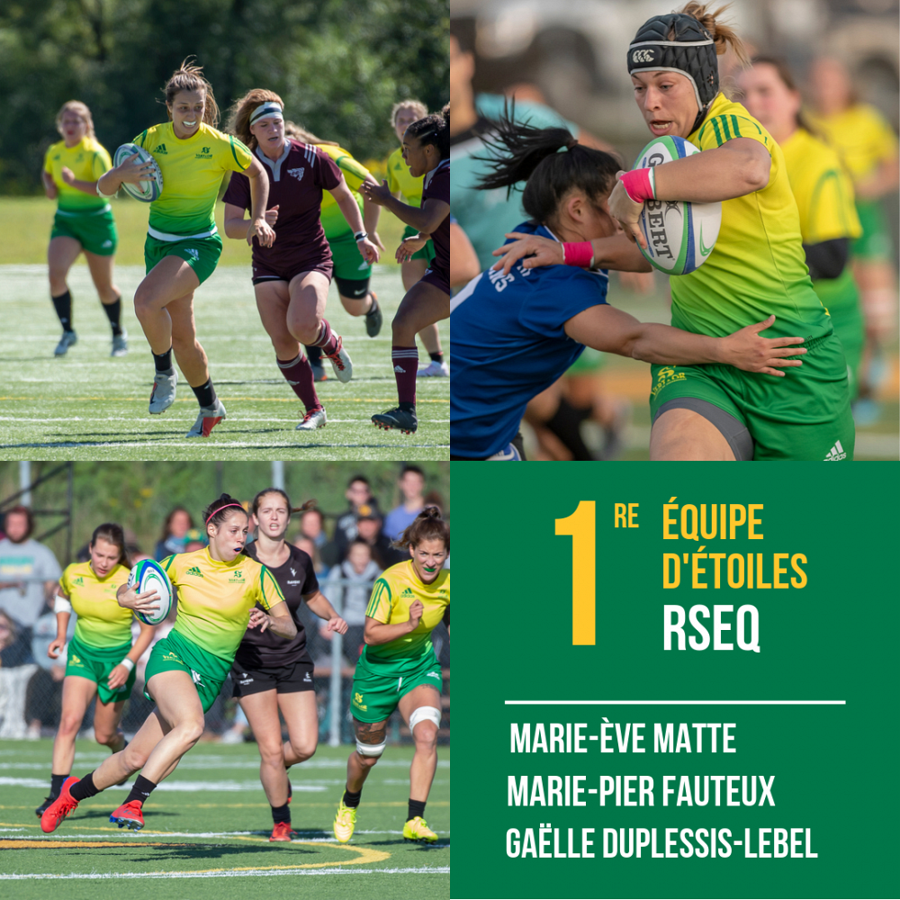 Le Réseau du sport étudiant du Québec a annoncé aujourd'hui ses deux équipes d'étoiles pour la saison 2019 de rugby féminin. Parmi la 1re équipe d'étoiles figurent 3 porte-couleurs du Vert & Or.