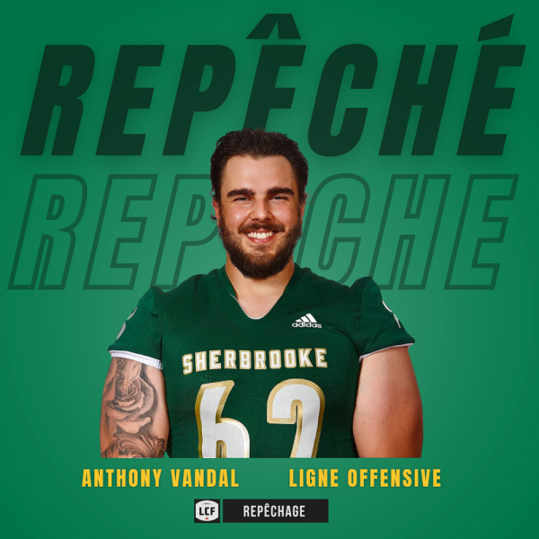 Le repêchage annuel de la Ligue canadienne de football (LCF) se déroulait le mardi 2 mai dernier en soirée. Entouré de sa famille et de ses amis dans un restaurant à Sherbrooke, Anthony Vandal a reçu la nouvelle tant attendue lors de la huitième ronde de l'événement : le joueur de ligne offensive du Vert & Or se rendra officiellement à Toronto afin d'y lancer sa carrière de footballeur professionnel avec les Argonauts, champions en titre de la Coupe Grey.