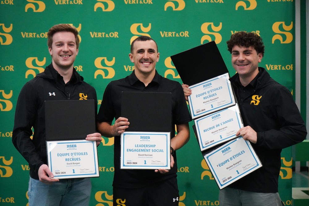 La recrue Maxime Bourgeois a cumulé les mentions d’honneur les unes après les autres passant de la recrue masculine par excellence du RSEQ à faire partie de la 2e équipe d’étoiles masculines et de l'équipe d’étoiles recrues masculines du RSEQ. L’étudiant en éducation physique a rejoint également les rangs de l’équipe d’étoiles des recrues USports. Le défenseur David Harrison obtient le prix Leadership et engagement social pour une 2e année consécutive. De son côté, le gardien de but David Burgun rejoint son coéquipier sur l’équipe d’étoiles recrues masculines RSEQ.