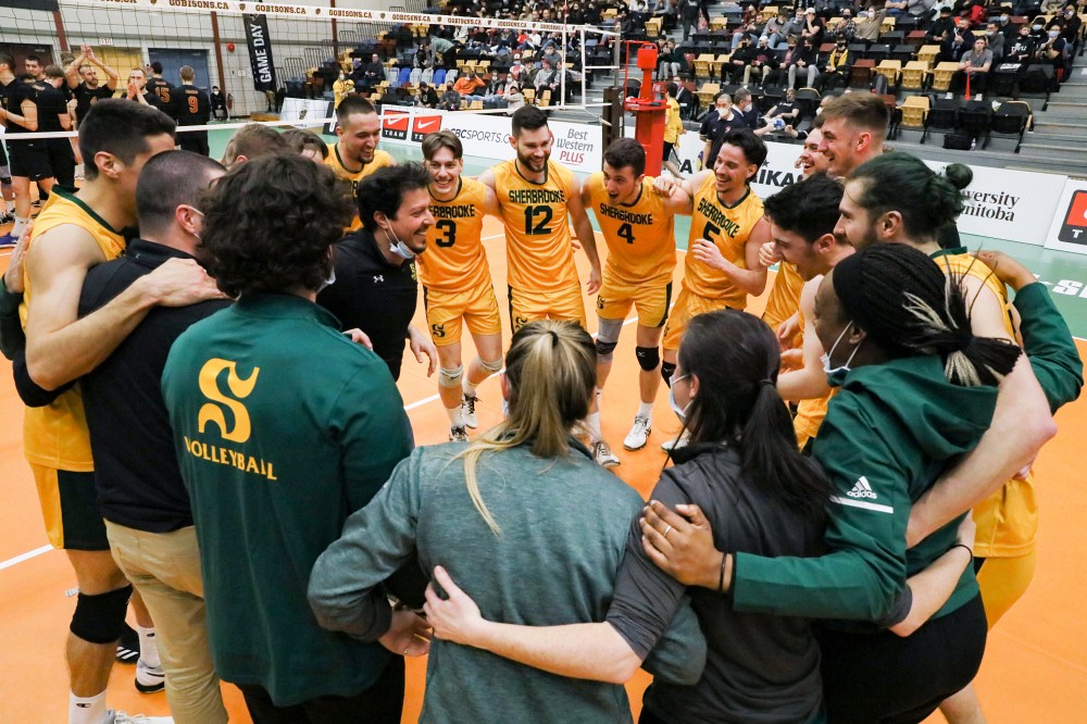 Que c’était beau de voir les volleyeurs sherbrookois qui jubilaient et se félicitaient au centre du terrain du Centre sportif Investors Group de l’Université du Manitoba, alors qu’au tableau indicateur, le pointage final de cette rencontre indiquait 25-23, 31-29, 22-25 et 25-22 à leur avantage. Une tonne de pression qui venait de tomber, et la rarissime occasion de faire une place de choix sur la scène nationale aux couleurs vert et or.